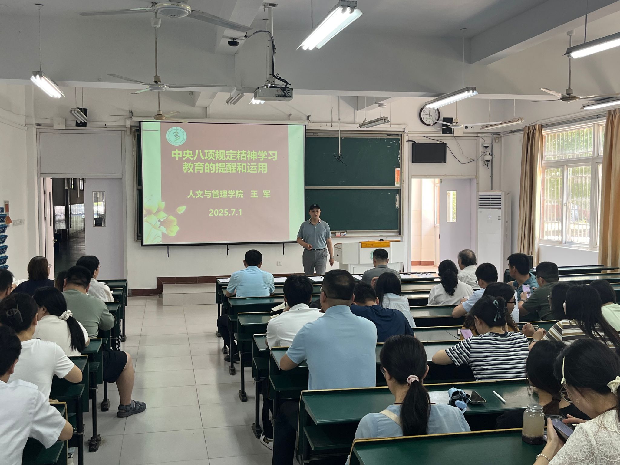 为加强作风建设,全面总结学期工作,科学谋划暑期及下一阶段任务,7月1日,新葡萄官网amg召开期末全体教职工大会并开展人文思政讲坛-深化对中央八项规定精神的理解并提高执行力。会议由学院党委书记王军主持。