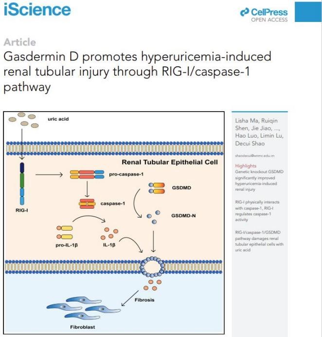 近期,新葡萄官网amg生理学与神经生物学教研室邵德翠科研团队的研究成果《Gasdermin D promotes hyperuricemia-induced renal tubular injury through RIG-I/caspase-1 pathway》在SCI中科院二区杂志《iScience》(IF:5.8)在线发表,创意揭示高尿酸血症诱导肾小管损伤的新机制。
