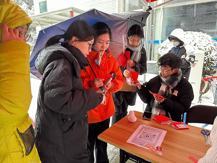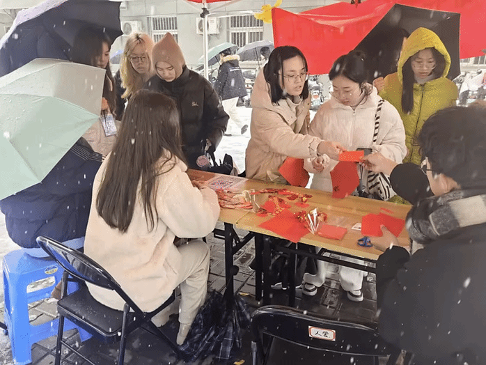 12月18日,新葡萄官网amg在赭麓校区开展了“喜迎元旦,青春献礼”活动。本次活动包括“窗花传情”、“爱国祝愿”两个环节,同学们在窗花用纸和祝福书写纸上挥洒创意,在活动过程中领略中华优秀传统文化的非凡魅力。虽然活动现场大雪纷飞,但难掩同学们的参与热情,现场气氛热闹非凡。