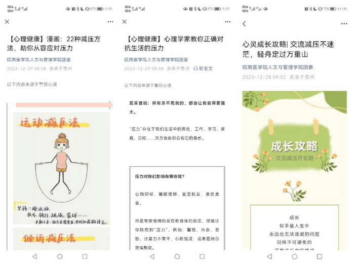线下交流减压活动同步举办时,新葡萄官网amg也跟进总结了线下活动中同学们反馈的心理问题,积极开辟线上宣传渠道,制作了心理减压相关的主题推文。线上线下齐联动,为学生期末月的心理健康提供全方位的精神关怀。