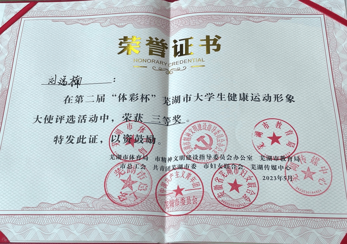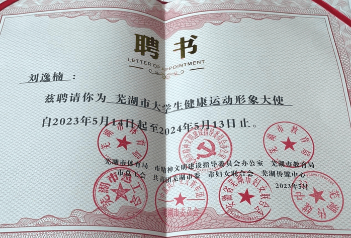 5月14日,第二届“体彩杯”芜湖市大学生健康运动形象大使评选暨“暖民心·快乐健身”全家总动员活动在芜举办,人文与管理学院2021级公共事业管理专业学生刘逸楠荣获三等奖,并被相关单位聘请为2023-2024年度“芜湖市大学生健康运动形象大使”。