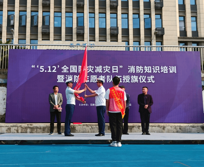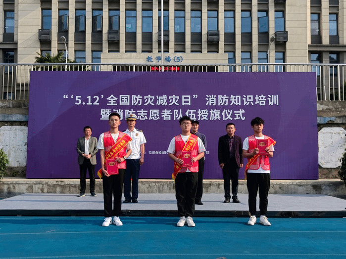 5月12日,芜湖市镜湖区消防救援大队在我校开展“5.12全国防灾减灾日”消防知识培训暨消防志愿者队伍授旗仪式。新葡萄官网amg“博谘”实践队全体志愿者,党委书记王军和党委副书记钱彬彬出席活动。