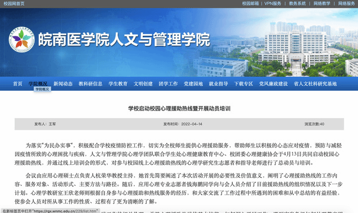 (四)实践“为民办实事”。落实“党旗在一线高高飘扬”,充分发挥多学科、专业化优势,服务地方经济社会。王国平教授主持南陵县“十四五”卫生与健康规划研究与编制,并为芜湖市卫生规划作前期论证。心理学党支部长期开展校内免费心理咨询,在疫情期间专程启动校园疫情心理援助热线,并参与2021年河南暴雨公益心理援助。支部党员杭荣华教授2022年初荣获全国“十佳优质督导师”称号。
