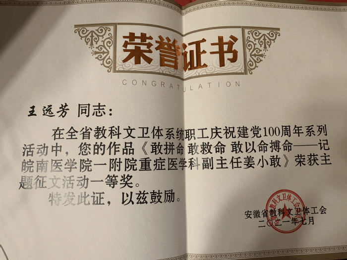 王远芳获得全省教科文卫系统庆祝建党百年征文比赛一等奖
