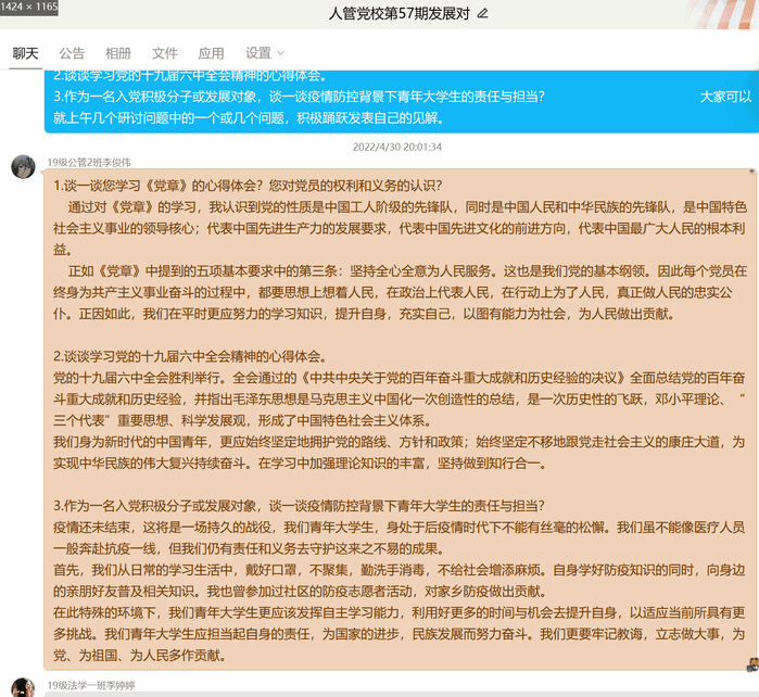 为进一步加强对入党积极分子和发展对象的教育培养,经学校党委研究决定,于2022 年 4月 24日开始举办中共新葡萄官网amg委员会党校第五十七期培训班通过线上开班。本次党课由培训采取专题讲座、观看视频、个人自学、在线研讨、学唱《国际歌》等形式,新葡萄官网amg共47名入党积极分子和19名发展对象参加培训,由班主任王燕威带班培训。
