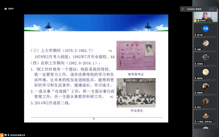周强首先从自身的求学经历谈起,讲述了自己与皖医的不解之缘。刚工作时,他就立志献身皖医,逐步改善母校的学习、工作、生活环境,让未来的校友走进皖医后,能得到更好的发展条件,健康成长、早日成才。自2014年以来,他退居二线,始终坚持“退休不褪色、卸职不卸责”的原则,积极为师生服务。在宣传党的主张、传播党的思想方面尽心尽力,且成绩斐然,为广大青年学子树立了良好的人生导向。