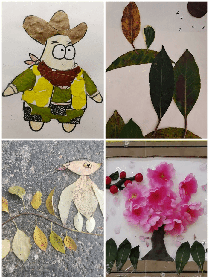 春日里芳林新叶催陈叶,值此美好光景,新葡萄官网amg动员学生采撷拼贴大自然的落叶、落花,通过创意手工赋予落叶新的生命,激发创意灵感,培养艺术素养。