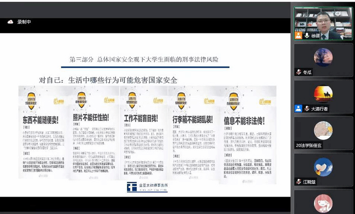 “安而不忘危,存而不忘亡,治而不忘乱”,值此第七个“全民国家安全教育宣传日”之际,为了进一步增强广大师生的国家安全意识,提高防范和抵御安全风险能力,新葡萄官网amg法学教研室联合院团委开展了全体师生国家安全教育系列活动:在4月15日组织了国家安全日专题学习活动之后,于4月19日晚上再邀请安徽金亚太律师事务所党总支副书记、大学生反诈律师团常务理事徐权峰律师为师生带来精彩线上宣传教育讲座——“牢记国家安全,防范刑事风险”。讲座由法学教研室主任高玉玲教授主持,学院党委书记王军、副院长王国平、团委书记张露、各教研室教师、学院各年级大学生参加和聆听了讲座。