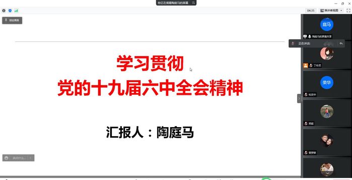4月21日下午,新葡萄官网amg开展线上主题党日活动,举办第三期“人文思政学习讲坛”暨党的十九届六中全会精神专题读书班。会议由学院党委书记王军主持,邀请马克思主义学院副院长陶庭马博士主讲,全院教职工参加。