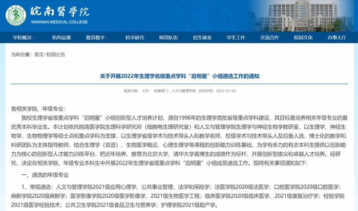 生理学省级重点学科“启明星”小组、新葡萄官网amg“启明星”小组创新型人才培养中心于1月5日在校园网发布《关于开展2022年生理学省级重点学科“启明星”小组遴选工作的通知》,按照高标准、高素质的条件要求,面向全校启动新成员遴选工作。在各方大力支持下,临床、麻醉、影像、法医、口腔、护理公卫、检验等学院与本院14个专业的优秀学生经过自主申请、学院推荐、交叉推荐、培养中心面试、指导教师与学生双向选择等严格程序,最终有23人荣获2022年度“启明星”小组成员资格,另有13人获得“2022年‘启明星’小组遴选入围奖”。