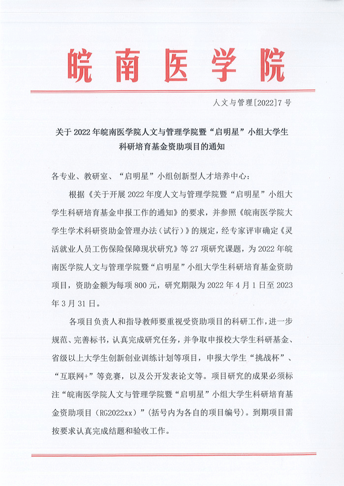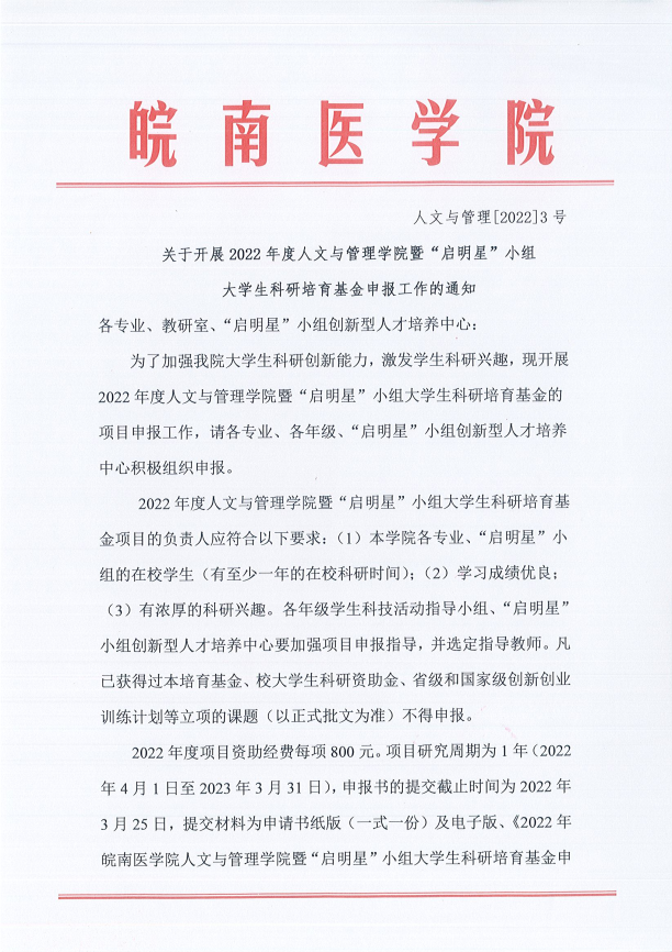 3月5日,《关于开展2022年度新葡萄官网amg暨“启明星”小组大学生科研培育基金申报工作的通知》(人文与管理[2022]3号)发布,新一期“启明星”小组成员一经建立自己的创新能力训练项目小组,即在指导教师的引导下,积极按照通知要求开展培育基金申报工作,共申报了23项,4月1日成功获批21项。