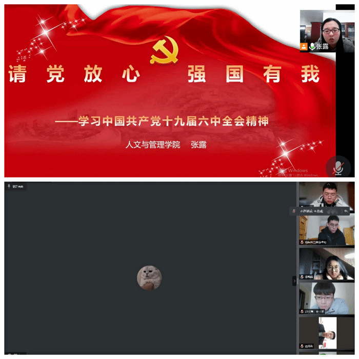 开篇伊始,张露从“深刻领会党的十九届六中全会的重大意义”“全面把握党的十九届六中全会的主要内容”“深入落实党的十九届六中全会的重要精神”三个方面对党的十九届六中全会精神作了全面系统的阐述,深入解读了中国共产党百年奋斗的光辉历程、伟大成就、宝贵经验和实践启示,高度概括了中国特色社会主义新时代的历史性成就和历史性变革,指明了在新征程上以史为鉴、开创未来的根本要求,引导大家对全会精神再学习、再认识、再思考。同时,对寒假志愿活动进行了布置和讲解,并就疫情防控、挑战杯等工作提出了明确要求。