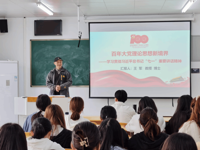 23日上午,王军以《百年大党理论思想新境界——学习贯彻习近平总书记“七一”重要讲话精神》为题开讲党课,将习近平总书记“七一”重要讲话精神概括为“新思想的理论自觉,新时代的政治宣言”,对于其中的重大理论创新进行了阐释与分析,重点就讲话所揭示的“新的历史方位”、“四个党史分期”、“‘伟大建党精神’之于‘共产党人精神谱系’”、“九个必须”中的精华要点作了深入讲解。并指出中国共产党的诞生始于青年,青年是党在新时代领导全国各族人民实现中华民族伟大复兴的先锋力量。号召入党积极分子以实现“国家富强、民族振兴、人民幸福”为己任,跳出“小自我”,融入“大时代”,胸怀“国之大者”,增强做中国人的志气、骨气、底气,进一步坚定信仰、信念、信心,成为中国特色社会主义事业合格的建设者与接班人。