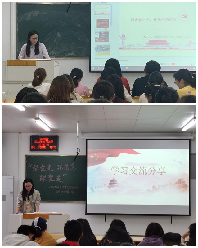 4月19日,保险19(01)班团支部以“学习党史,展望今朝”为主题,对建党一百周年以来所走过的风雨征程和光辉历史进行了回顾,团委学生副书记乔迈参加团支部学习交流,鼓励同学们“不忘初心、牢记使命”,在新的时代紧跟党的伟大步伐,创造美好未来。4月23日,心理19(01)、心理19(02)团支部组织团员青年开展“学党史、强信念、跟党走”主题团日活动,乔迈以“新民主主义革命”为主题,带领同学们对新民主主义革命的历史背景和具体的革命历程进行了回顾,让同学们牢记历史的同时发扬先辈们的精神,在学习和工作中敢于面对艰险、迎难而上。