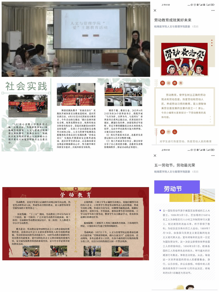 开展一次集中宣传活动。4月28日,新葡萄官网amg团委展开“三爱”学习主题教育活动,由学院团委副书记张露讲授,2020级全体团干参加。张露以闻一多的主要事迹为开篇,其爱读书、爱国情感影响了在场的每一位学生。青春正当时,逐梦新征程,张露鼓励同学们积极学习优秀文化思想,全面提高自身素质,脚踏实地、勇担重任,努力成为新时代的先行者。4月28日,新葡萄官网amg学生会宣传部制作并张贴了“劳动教育”和“实践活动”两块展板,图文并茂地展现了新葡萄官网amg近期劳动教育的成果。4月29日至5月1日,新葡萄官网amg学生会微信公众号发布两篇推文《劳动教育成就美好未来》、《五一劳动节,劳动最光荣》,全面做好劳动教育宣传工作,营造良好舆论氛围。