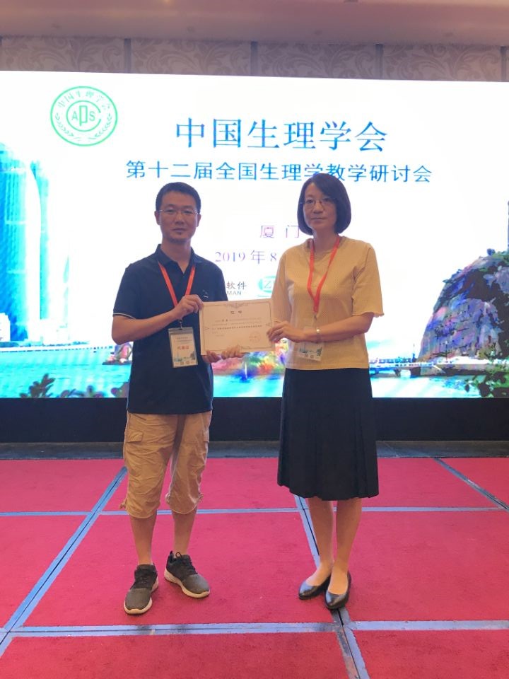 会上,我校生理学教学团队共提交会议论文摘要4篇,其中郑超老师的“创新理念始终贯穿生理学教学的实践与思考”被遴选为大会报告,报告指出在开展生理学特色教学、培养创新复合型人才中,我们积极响应国家号召、高度符合社会需要,引起与会者的广泛共鸣。汪萌芽老师的“以创新型人才培养为导向的实验室开放设计与实践”、张环环老师的“以生物-心理-社会医学模式为导向的《生物医学概论》课程建设初探”、徐爱萍老师的“面向普通医学院校医学影像学专业的生理学双语教学探索与实践”进行书面交流。同时,汪萌芽教授作为中国生理学会常务理事、人民卫生出版社《生理学》第9版教材的作者,应邀作了题为“有关细胞电生理学教学的若干问题”的大会报告。他紧密结合生理学教学难点,以及解决实际教学问题的解惑之道,进行了详细阐述。汪教授还作为特邀嘉宾在“生理学教学的今天和明天”的主题讨论中,提出了“不忘初心”——加强创新能力训练、“面向生命”——重视心理生理学培养以适应“生物-心理-社会医学”模式的创新型人才等观点,给在座的全国生理学教育工作者们以新的启迪。会议期间,汪萌芽还作为继任委员出席了新一届中国生理学会教育工作委员会会议、作为颁奖嘉宾为微课比赛获奖者颁奖。此外,我校生理学教学团队在暑期期间还应邀参加不同类型的教学交流活动。8月6日,汪萌芽教授应邀为“中国生理学会生理和行为学实验培训班”作了题为“脊髓运动神经元的细胞电生理技术与突触传递研究”的特邀专题报告,得到与会者的一致好评。
