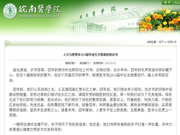 为做好2013届毕业生文明离校工作,新葡萄官网amg高度重视,认真谋划,以“情系母校,志在四方,共圆中国梦”为主题开展了丰富多彩的毕业生文明离校活动。 一、广泛动员,营造良好文明离校氛围 5月15日,该学院通过校园网向全体毕业生发出了《新葡萄官网amg2013届毕业生文明离校倡议书》,饱含深情向即将离别的学子们道一声珍重,并号召学生以健康文明的方式告别母校,感谢师恩,情系母校,营造了良好的文明离校氛围。