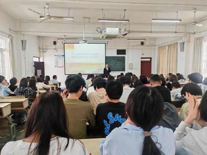 周强以“学习贯彻习近平文化思想,争做民族复兴大任奋斗者”为主题,从习近平文化思想的产生渊源、重大意义、丰富内涵等方面展开,强调要学习优秀传统文化,要和当代的实际结合起来。周强着重阐释了社会主义核心价值观,引导大家结合自己的理想和抱负,同时以信念的特征和功能作为切入点,对参会学生进行理想信念教育,勉励学生要树立远大的志向,要立志成为有理想、敢担当、能吃苦、肯奋斗的新时代好青年。