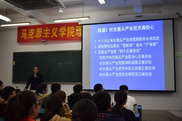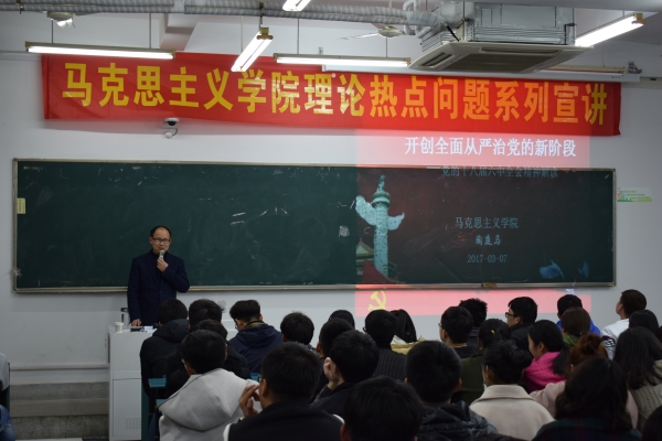 思想引领齐聚力,文化认同勇担当。为进一步树立和践行社会主义核心价值观,强化理想信念教育,2017年3月7日晚七点,新葡萄官网amg在1102教室举办了十八届六中全会以来的理论热点问题宣讲。本次讲座诚邀到马克思主义学院副院长、陶庭马副教授主讲,新葡萄官网amg入党积极分子和全体党员同学共计150余人聆听了讲座。