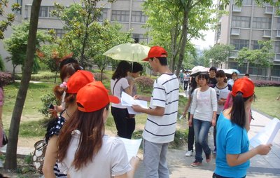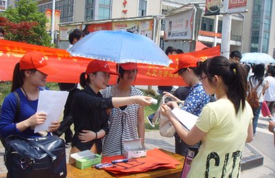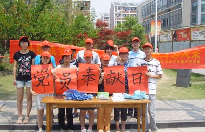 为深入开展“创先争优”活动, 5月17日上午,人文与管理系第三学生党支部全体学生党员在党支部书记吴映辉的指导下,在我校二食堂门口开展了“弘扬我党先进作风,展现人管支部风采”的党员奉献日活动。