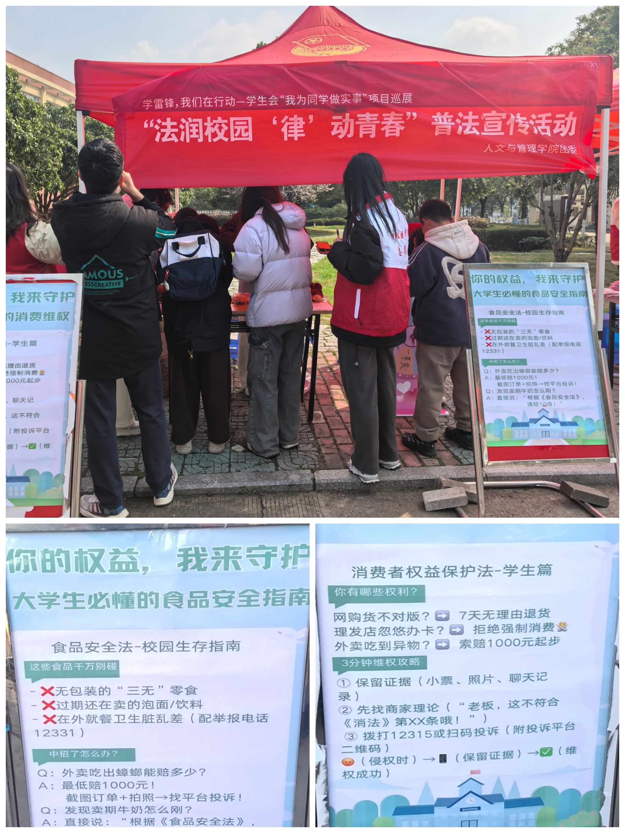法润青春正当时,律护权益启新章。为增强学生法治观念、筑牢权益保护意识,3月16日,新葡萄官网amg在滨江校区南区举办“我为同学做实事”主题普法活动。活动以生动形式普及消费者权益保护法、食品安全法,旨在引导学生在生活中知法、懂法、用法。