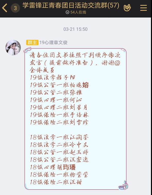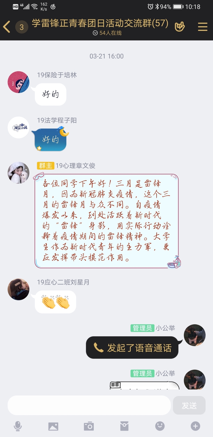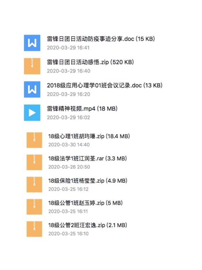 为弘扬雷锋精神,践行志愿服务,将雷锋精神融入到当代大学生的青春实践中去,同时激发学生干部的示范引领作用,2020年3月份,新葡萄官网amg组织开展了为期一月的“学雷锋”主题活动,并于3月21日下午四点,学院团委召开了“传承雷锋精神,凝聚青年力量”主题团日活动,2018级、2019级各班团干通过网络平台积极参与其中。