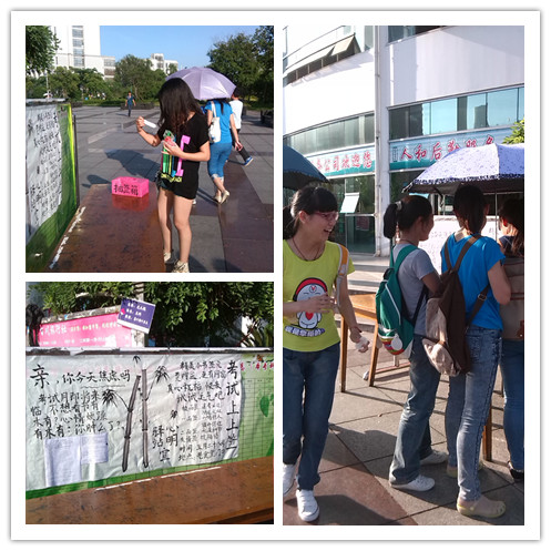 考试上上签 调节备考心理。考试月即将来临,5月58日中午,“心明驿站”在老食堂门口开展了“考试上上签”活动.贴出了关于考试焦虑的测试题,同学们对自身心理状况作出评估.随后,采取自由式无监督的活动方式,将抽签箱放置在桌上由同学随意抽取,头脑风暴的形式解答目前考试焦虑等心理问题,通过抽签的方式,对学生做积极的心理暗示.更能引起学生的兴趣和解答的热情。