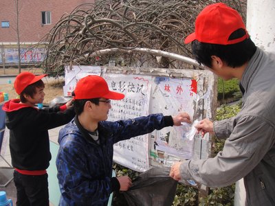 志愿者拿起小刀和抹布清理、铲除宣传栏和公共物品上的小广告,用实际行动感召大学生,美化校园,为广大师生提供更优雅和谐的学习生活环境,为文明校园的建设添砖加瓦!