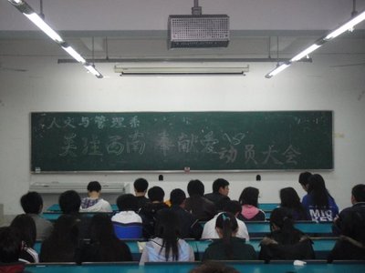 4月9号晚7点,人文与管理系团委、学生会在西104教室举办了以 “关注西南,奉献爱心”为主题的献爱心动员大会。大会由系团委、学生会承办。学生会全体学生干部参加了本次活动。