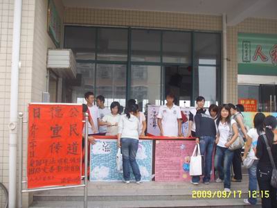 9月20日是第一个公民道德宣传日。“关爱、文明、表率”是今年道德宣传日的主题。为使同学们更加直接清楚地了解如何做一名有道德的公民,法学(1)班的同学们手工制作了一些宣传展板,以漫画的形式向周围的同学介绍了一些常识,并对同学们提出的相关问题一一作出解答,深得同学和老师的赞许。活动现场分工有序、气氛高涨,同学和老师纷纷前来签名以表示对本次活动的支持。此外,9月17日,人文与管理系法学(1)班在班长陶军军的带领下在学校食堂门口开展了一次公民道德宣传活动。系团总支书记吴映辉老师也到场作了指导。
