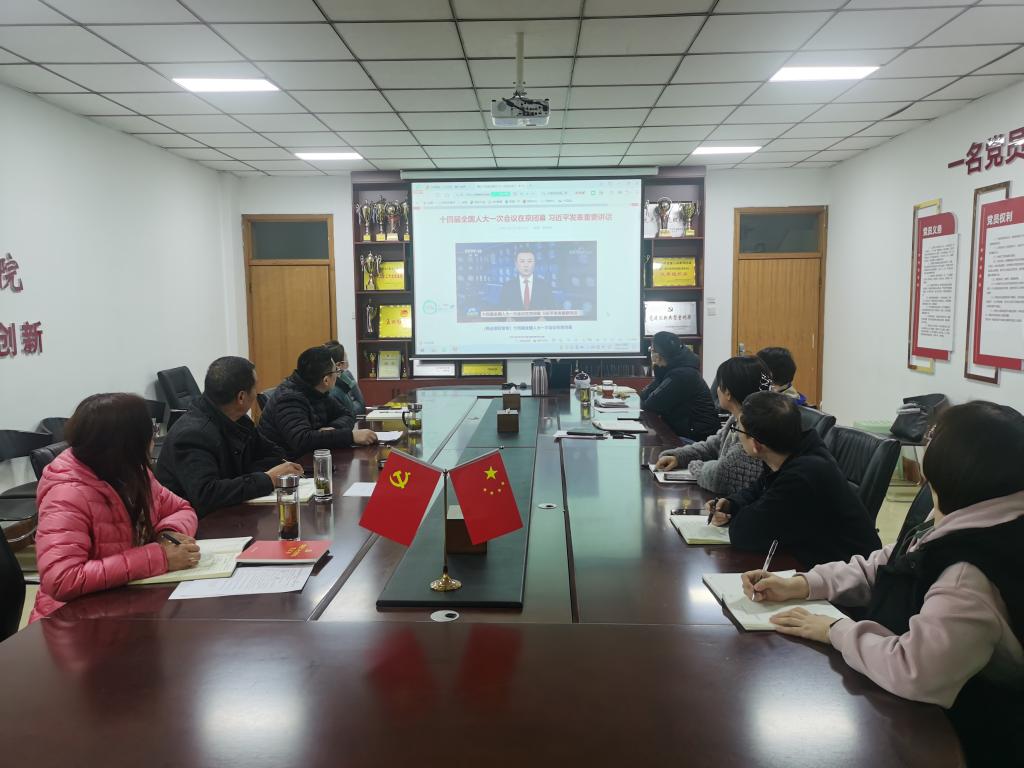 会上,院党委书记张松刚介绍了2023年全国两会的基本情况,系统总结了两会召开的时代背景、政治意义、做出的重大决策部署以及取得的一系列辉煌成果,重点传达领学了习近平总书记重要讲话精神。随后,与会人员认真收看了《十四届全国人大一次会议在京闭幕 习近平发表重要讲话》的新闻报道,大家一致表示,要深入学习领会两会精神,坚定历史自信,彰显使命担当,在新时代新征程中更好发挥教师立德树人的天职,以学院高质量发展不断推动学校教育事业的改革创新。