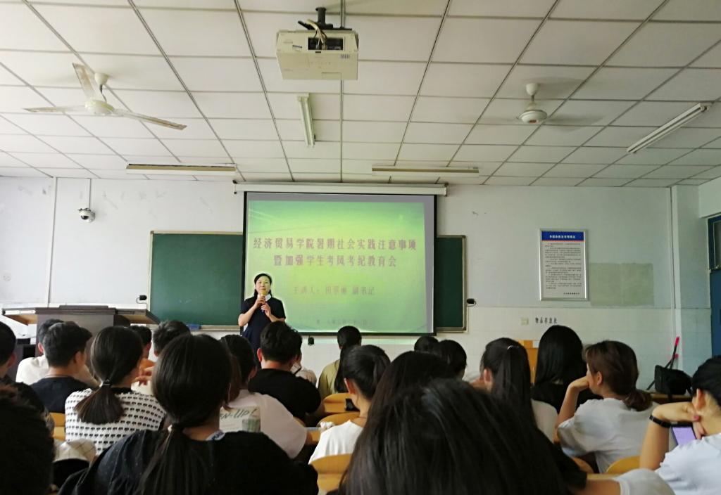 在暑期来临之际,为保障大学生暑期社会实践的安全、提高学生的防范意识,为期末考试营造良好的考风考纪氛围,经济贸易学院于6月21日下午在W207举办一场“经贸学院暑期社会实践注意事项暨加强学生考风考纪教育会”的讲座。本次讲座由经贸学院党总支副书记田景丽主讲,参加讲座的有16、17级辅导员张恣琼、祝栩,16、17级全体学生干部和宿舍长。