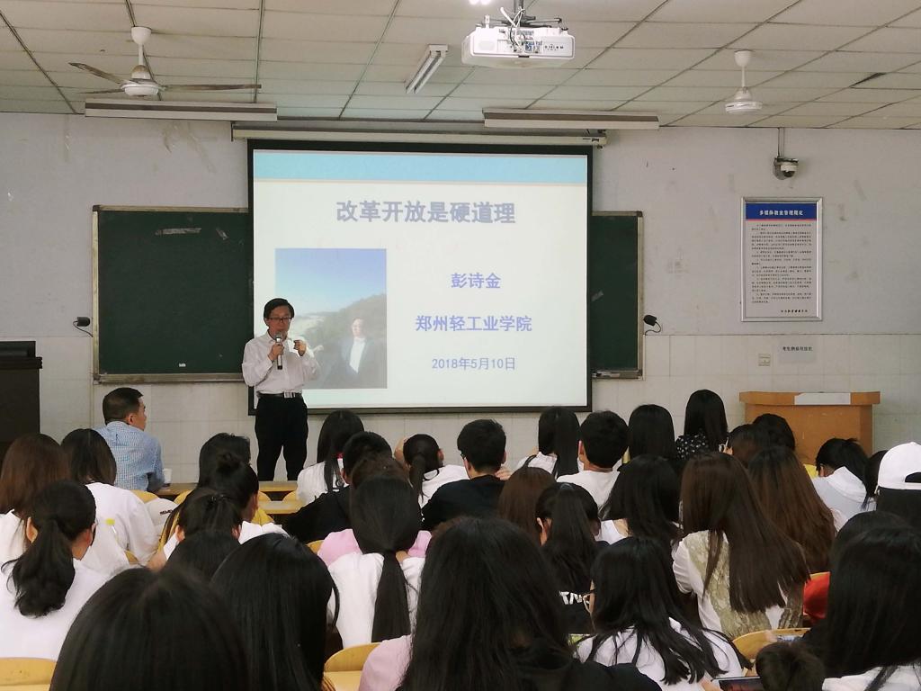为更好地学习习近平新时代中国特色社会主义思想,Beat365官网特邀请郑州轻工业学院彭诗金教授于5月10日下午3点在W103教室作题为“改革开放是硬道理”的讲座。讲座由高敏副院长主持,经贸学院部分教师和17级国贸1班、国贸2班、商代班的同学共同聆听了讲座。