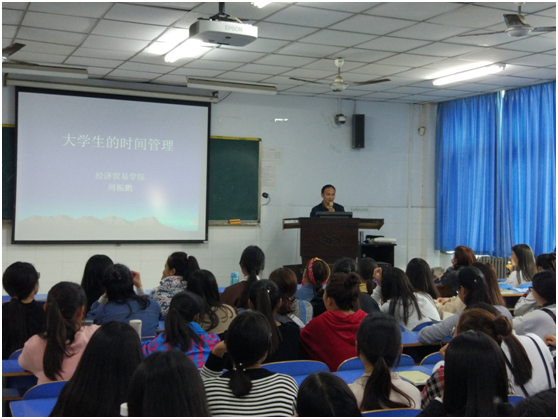 10月12日下午3点,经贸学院周末面对面系列讲座于东配楼E205室拉开帷幕。该系列讲座开展的主要目的是解决大一新生对大学生活的疑虑,引导新生更快更好地融入大学生活。本次讲座是该活动的首场讲座,主题为“大学生时间管理”,由经贸学院经济学教研室主任周振鹏老师主讲。周振鹏老师的幽默风趣使整场讲座气氛活跃,精彩纷呈。