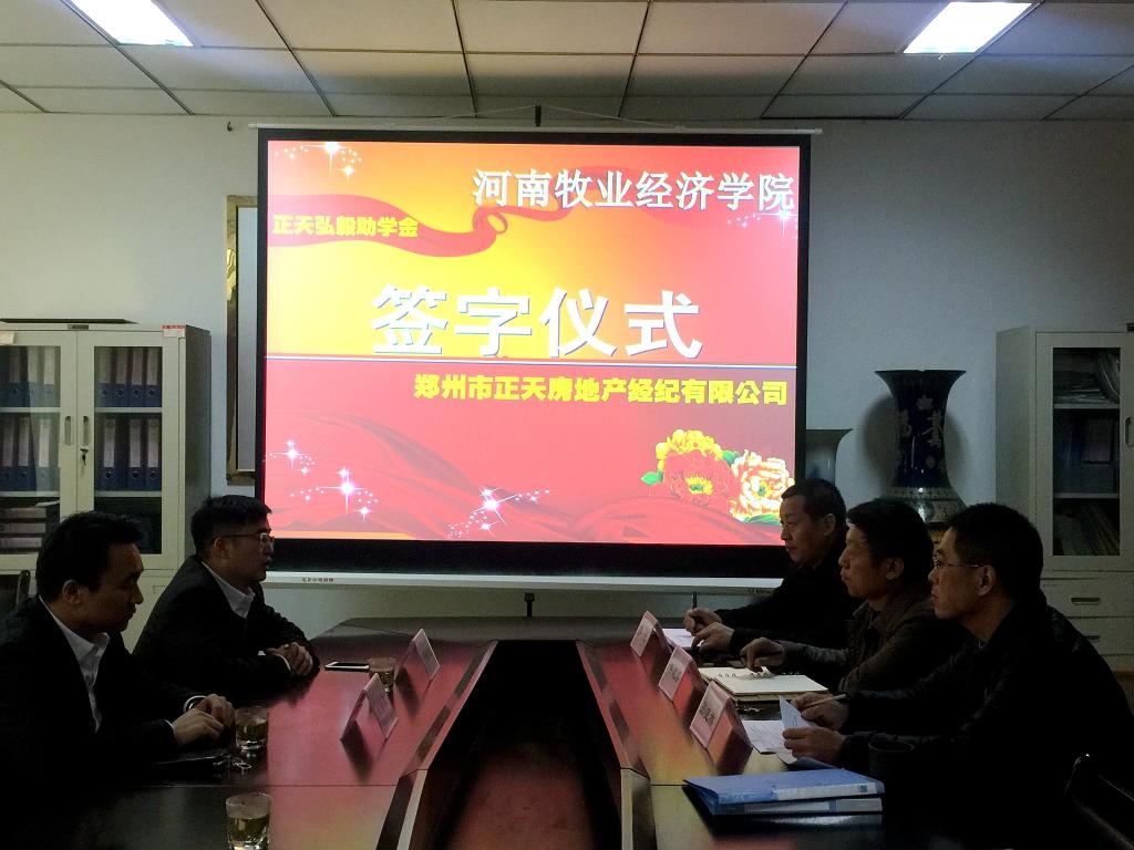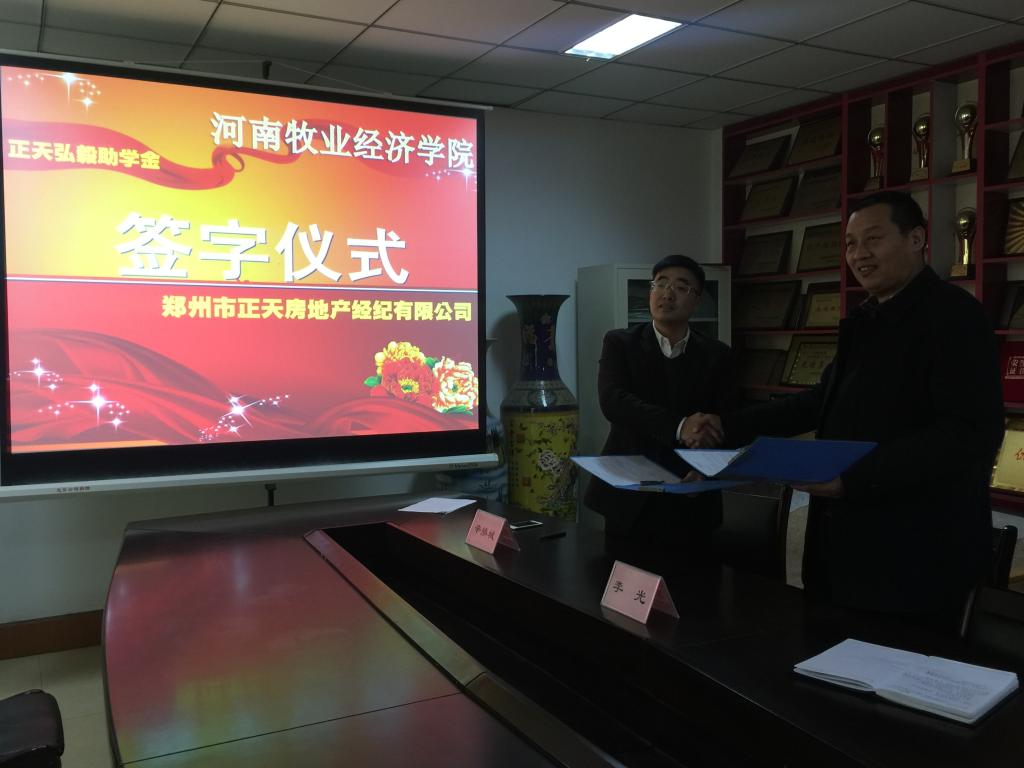 2016年12月2日上午十时,在河南牧业经济学院经济贸易学院会议室,经贸学院和郑州市正天房地产经纪有限公司签订捐资助学协议,签字仪式的参加人员有经贸学院的李光院长、牛建绥书记、孙晓林副院长、正天公司总经理辛换城先生和后勤总经理周拥军先生。会议由孙晓林副院长主持。
