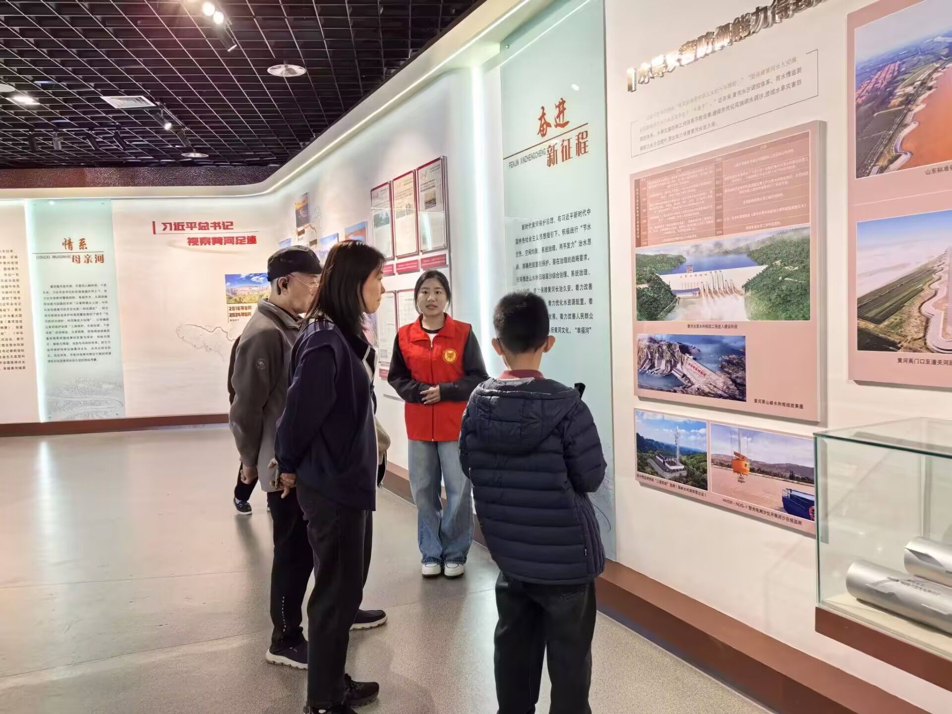 活动正式开始前,志愿者们已在各自负责的展厅就位,分别开始熟练讲解词,同时了解展厅布局,为讲解工作做准备。活动正式开始后,志愿者们凭借扎实的功底和认真热情的态度,获得了游客们的赞赏。在为年龄较小的孩子们讲述黄河故事时,志愿者们循循善诱,将黄河的历史知识讲得生动有趣,激发了孩子们的求知欲,让孩子们在游玩的同时也学习到了知识。活动期间,志愿者们还旁听了专业讲解员的讲解并认真观察学习,希望未来可以像这些专业人员一样,为游客带来更加生动、更加精彩的讲解体验。