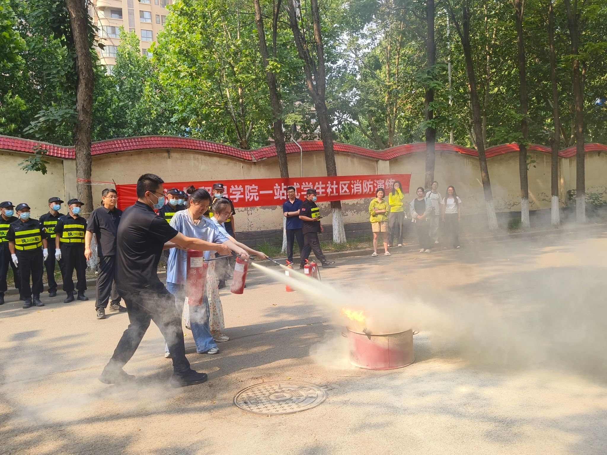 在理论知识讲解与实操演示结束后,进入了紧张而有序的实践环节。现场师生分批次上前实践,在专业人员的指导下,手持灭火器,对准火源根部,按照规范步骤进行灭火操作。同学们神情专注、动作规范,认真完成每一个步骤,切实掌握了灭火器的使用技能。