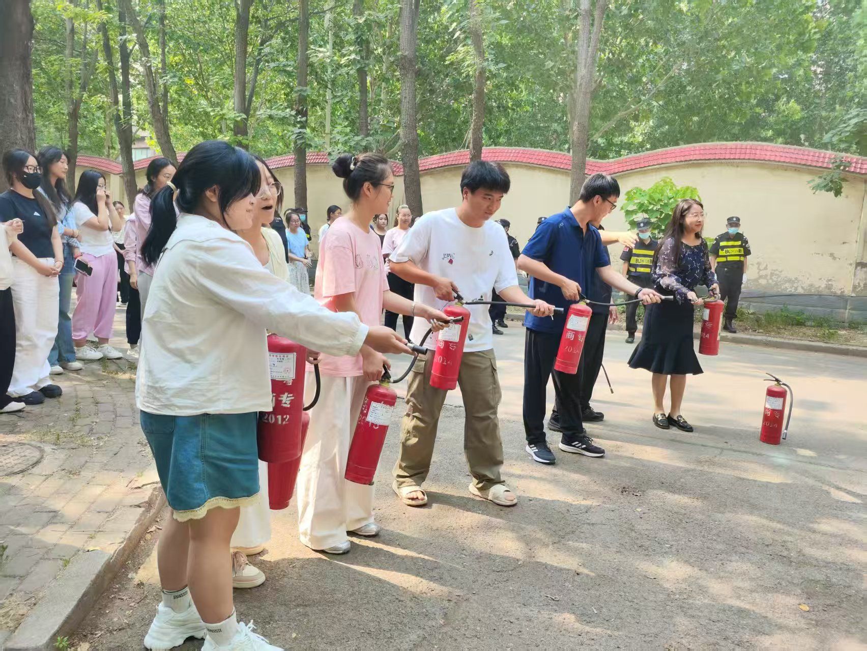本次演练特别邀请了学校保卫处的专业人员进行现场指导。活动伊始,保卫处同志通过生动的讲解和标准的动作演示,向在场师生详细介绍了消防灭火器的正确使用方法。从灭火器的类型识别,到 “提、拔、握、压” 的操作口诀,再到灭火时的站位与角度,每一个细节都讲解得深入浅出,让消防安全知识变得通俗易懂。