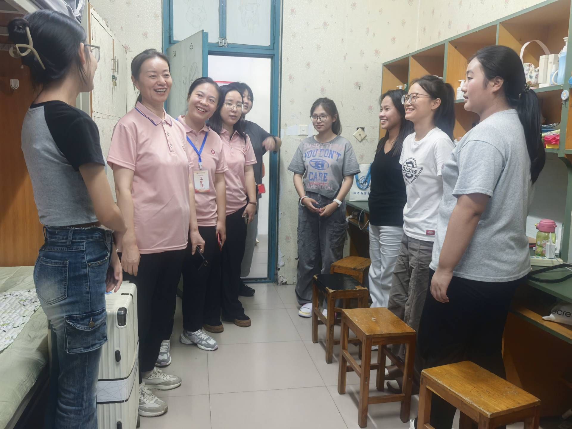 走进新生宿舍,院领导与老师们首先向同学们表达了热烈的欢迎和亲切的问候,一句句暖心的话语瞬间拉近了与新生的距离。在与新生的交流中,领导们细致询问大家对宿舍环境、饮食条件的适应情况,耐心倾听同学们在报到流程、课程安排、生活用品采购等方面遇到的疑问,并结合学院实际逐一给出相应解答。针对部分新生初到陌生环境产生的紧张情绪,老师们通过分享校园生活小贴士、介绍学院社团活动等方式,帮助大家缓解焦虑,让新生们切实感受到 “家” 的温暖。
