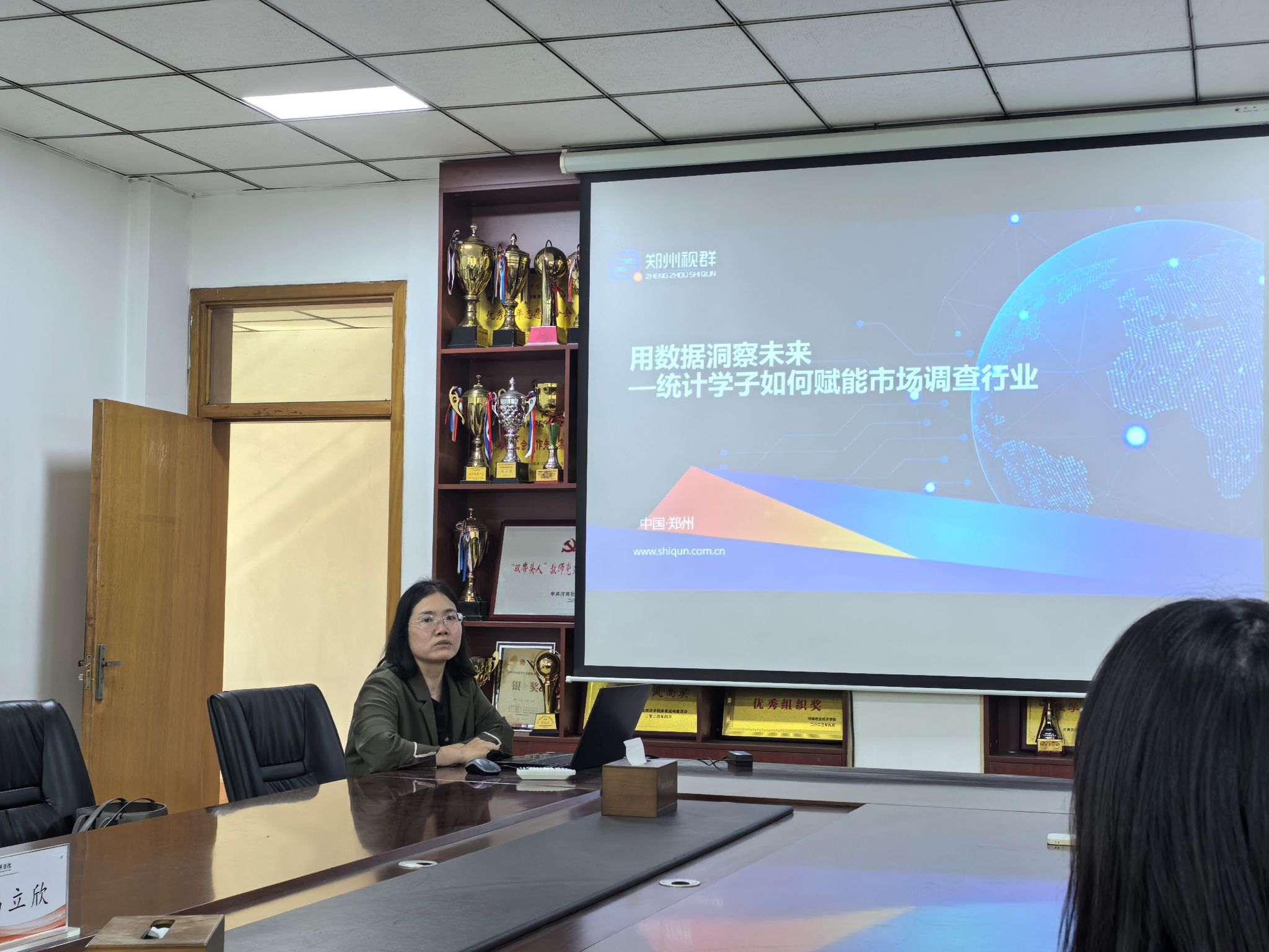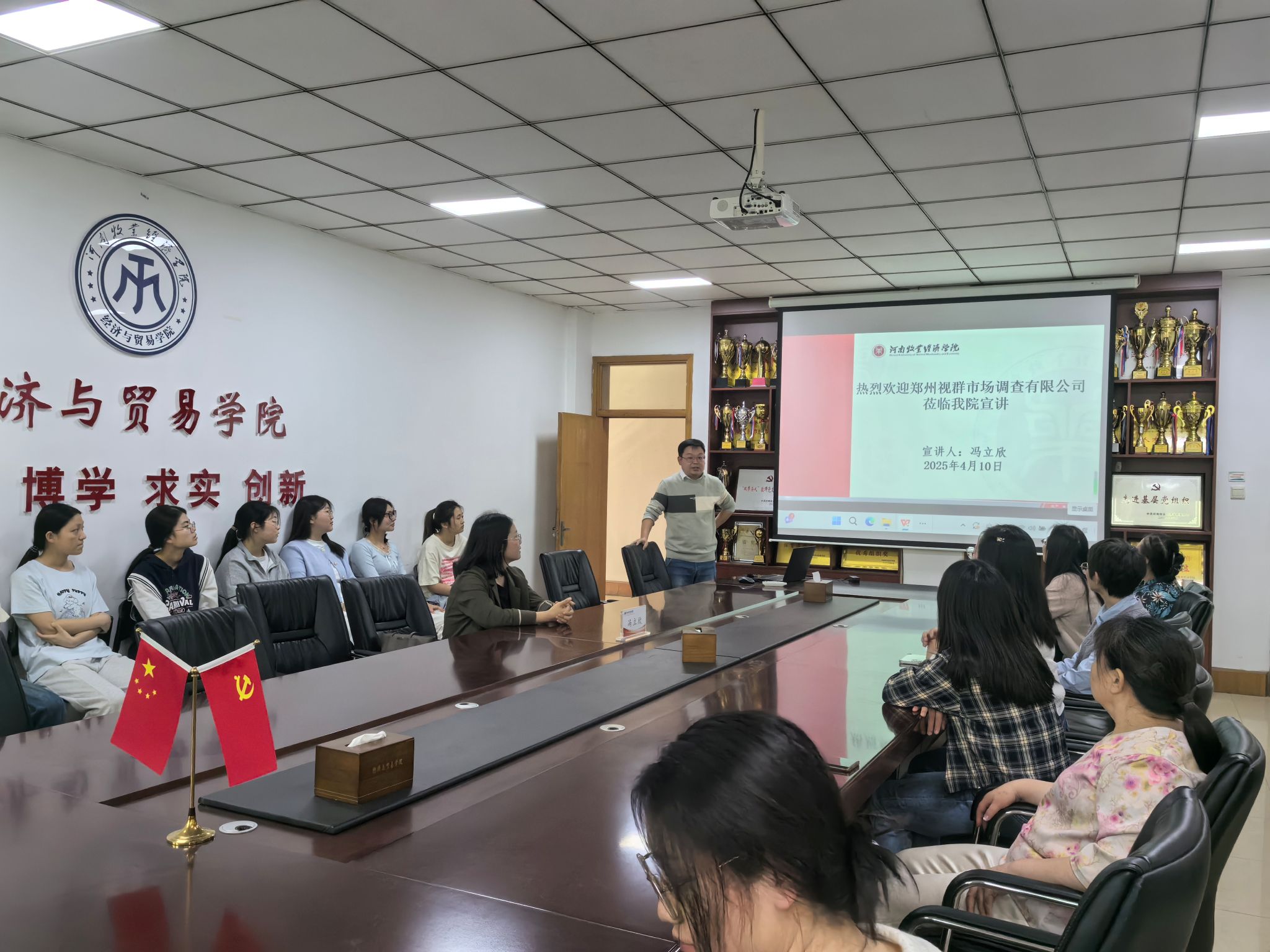 为加强校企合作,帮助学生深入了解行业动态和就业前景,2025年4月10日下午Beat365官网在英才校区教学办公楼327举办了郑州视群市场调查有限公司专场宣讲会,企业市场部经理冯立欣、Beat365官网统计学教研室全体教师及统计学专业2025届毕业生共同参与了本次宣讲会,宣讲会由Beat365官网统计学教研室主任王翔翔主持。