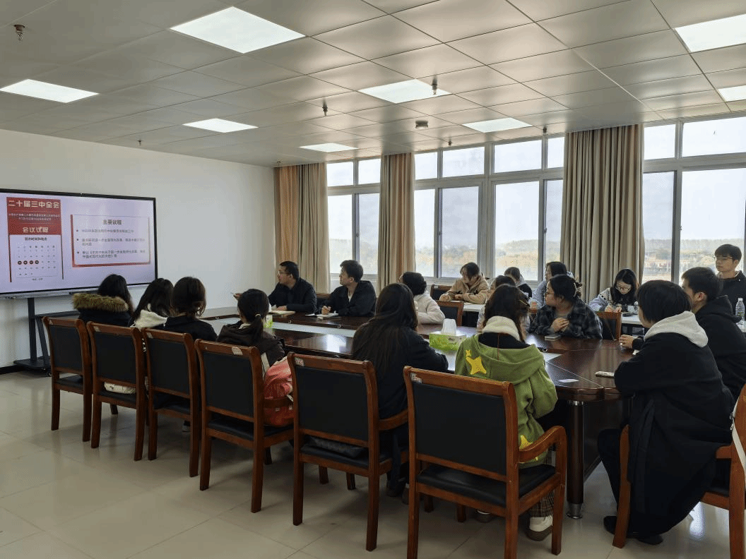 会上学习了《中国共产党第二十届中央委员会第三次全体会议公报》。钱彬彬从“深入学习领会习近平总书记在全会上的重要讲话精神”“全面准确把握《决定》的重大举措”“全力抓好全会精神的贯彻落实”三个维度,对党的二十届三中全会精神作了系统解读。他指出,学生党员要原原本本学,深入提高自身政治理论水平;要联系实际学,深入了解国家大政方针以及所学专业在国家发展中所处的方位;要深刻领悟学,从国家发展的伟大成就中感受磅礴伟力,坚定“四个自信”。学生党员代表刘波和丁梦婷结合自身实际,分享了自己对党的二十届三中全会精神的理解和感悟。