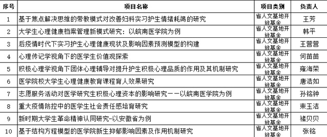 根据《关于开展2021年度校级科研项目申报工作的通知》文件要求,经项目负责人个人申报,所在部门审核,受科研处委托,学院组织专家评审,现将大学生心理健康教育研究中心安徽省人文社会科学重点研究基地开放基金项目拟推荐项目名单进行公示,公示期限为2021年6月24日至2021年6月26日。公示期间,如有异议,请书面向学院或大学生心理健康教育研究中心反映。联系电话:3932687,3932975。